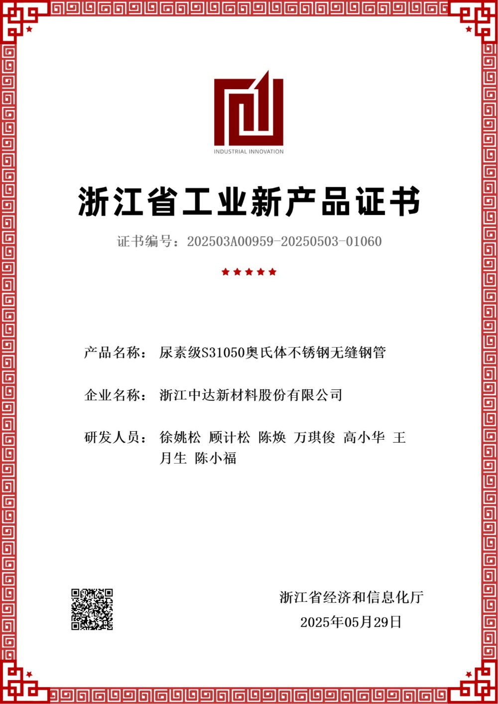 近日,中達(dá)新材再傳捷報(bào)!公司自主研發(fā)的超低溫液氫容器用奧氏體不銹鋼無(wú)縫鋼管和尿素級(jí)S31050奧氏體不銹鋼無(wú)縫鋼管兩項(xiàng)產(chǎn)品,成功通過浙江省經(jīng)濟(jì)和信息化廳的權(quán)威認(rèn)證,榮獲浙江省工業(yè)新產(chǎn)品證書。
